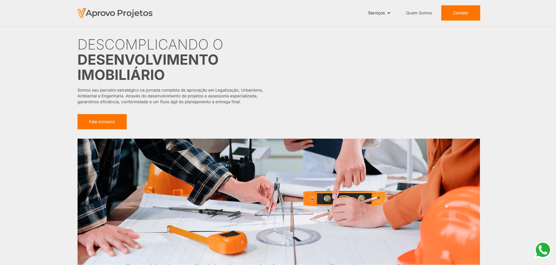 Website para a Aprovo Projetos, reforçando a oferta completa em legalização, infraestrutura e meio ambiente com estrutura visual intuitiva.