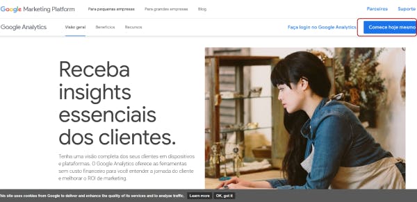 Utilize uma conta google para criar uma conta de Google Analytics 4, para poder gerenciar e administrar suas atividades na plataforma. Vá para a página do Google e clique em "Comece hoje mesmo".