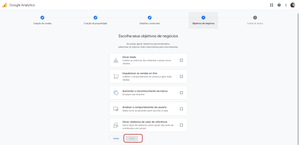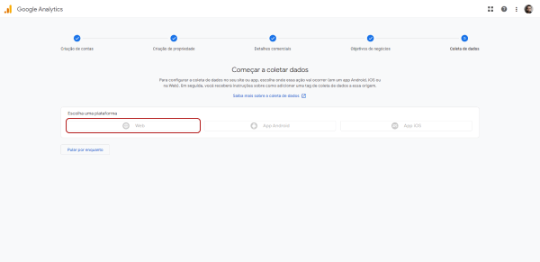 Pronto! Você criou uma conta e uma propriedade de Google Analytics 4 (GA4) e será levado para a página de dashboard do GA4. Falta agora configurar seu Google Tag Manager com a ID de rastreamento do GA4.